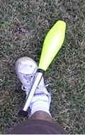 Another thing that's important about getting good kick-ups is the right footwear. You'll need to be able to point your toe up, so you'll need a good, flexible pair of tennis shoes (some people prefer barefoot). Start by placing the club over your foot as shown in the picture.