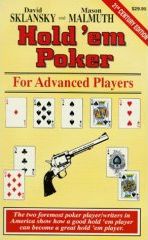 This book is considered the bible for Texas Hold'em strategy. As the name implies, the advice in this book is for advanced players, usually playing at the high limit tables. The book is specific to limit Hold'em ring games. It does not contain any no-limit or tournament advice. As with any Sklansky book, HPFAP contains a lot of theory to go with its advice.